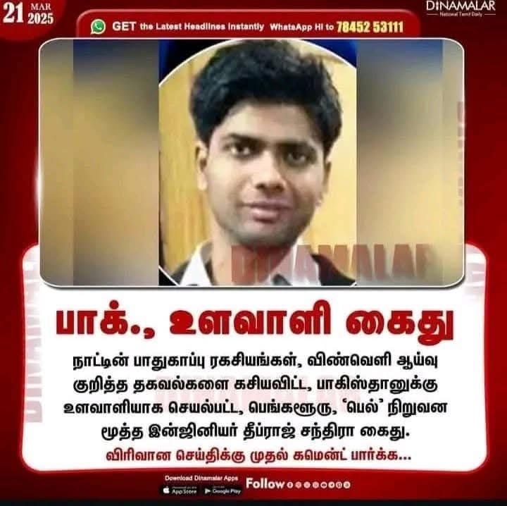 பெங்களூரு (மார்ச் 21, 2025): பாகிஸ்தானுக்கு உளவாளியாக செயல்பட்டு இந்திய ராணுவ கடற்படை ரகசியங்களை பாகிஸ்தானுக்கு கசிய விட்ட, பெங்களூரு ‘பெல்’ நிறுவன மூத்த இன்ஜினியர் தீப்ராஜ் சந்திரா கைது செய்யப் பட்டுள்ளார். – inneram.com