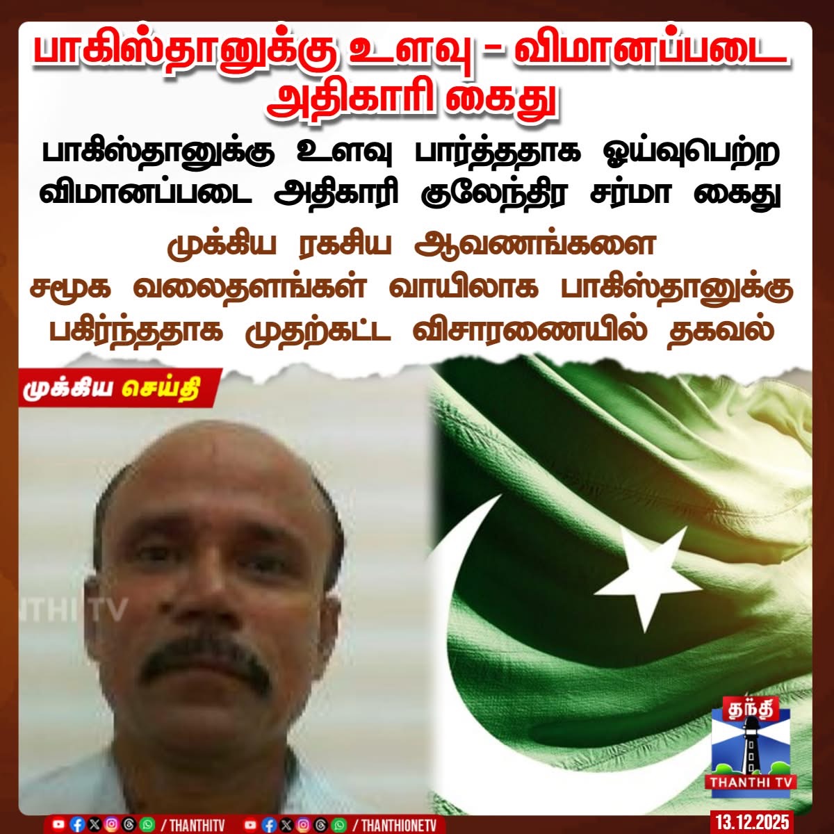 கவுகாத்தி (13 டிசம்பர் 2025): இந்திய நாட்டின் ராணுவ ரகசியங்களை விற்று, பாகிஸ்தான் உளவாளியாக செயல்பட்டு வந்த இந்திய விமானப் படையின் (IAF) ஓய்வுபெற்ற ஜூனியர் வாரண்ட் அதிகாரி குலேந்திர ஷர்மா அசாமின் தேஸ்பூரில் கைது செய்யப் பட்டுள்ளார்.