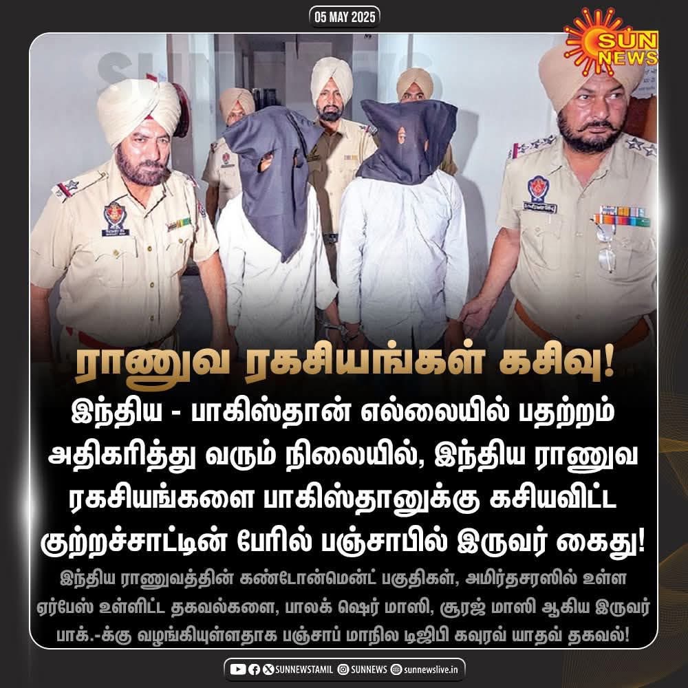 அமிர்தரஸ் (05 மே 2025): இந்தியா – பாகிஸ்தான் எல்லையில் பதற்றம் அதிகரித்து வரும் நிலையில், இந்திய ராணுவ ரகசியங்களை பாகிஸ்தானுக்கு கசியவிட்ட குற்றச்சாட்டின் பேரில் பஞ்சாபில் இருவர் கைது செய்யப் பட்டுள்ளனர்.