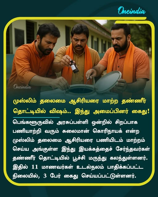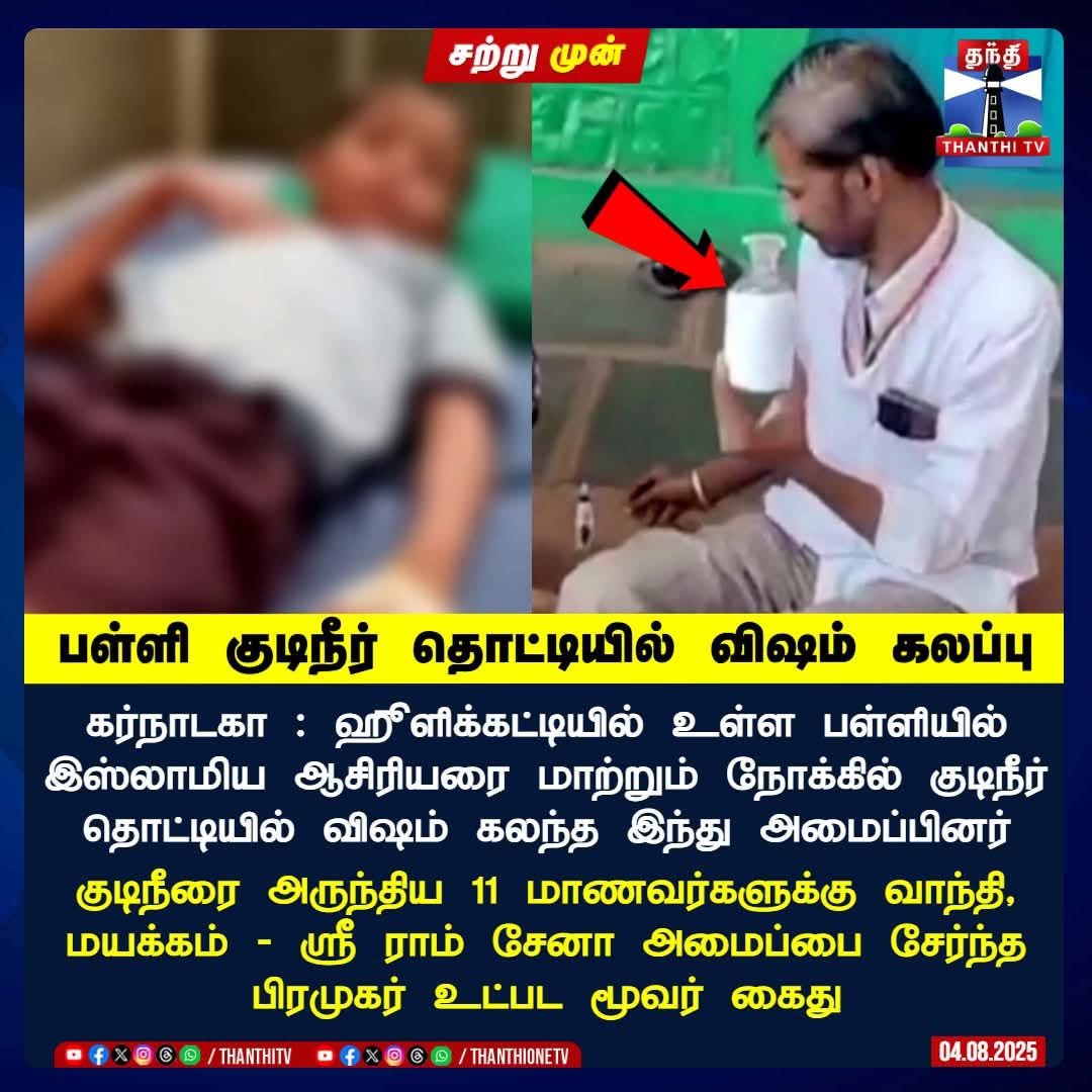பெங்களூரு (04 ஆகஸ்ட், 2025): கர்நாடகாவில் உள்ள பள்ளி தண்ணீர் தொட்டியில் இந்துத்துவா அமைப்பினர் விஷம் கலந்த சம்பவம், நாடெங்கும் அதிர்வலைகளை ஏற்படுத்தியுள்ளது.