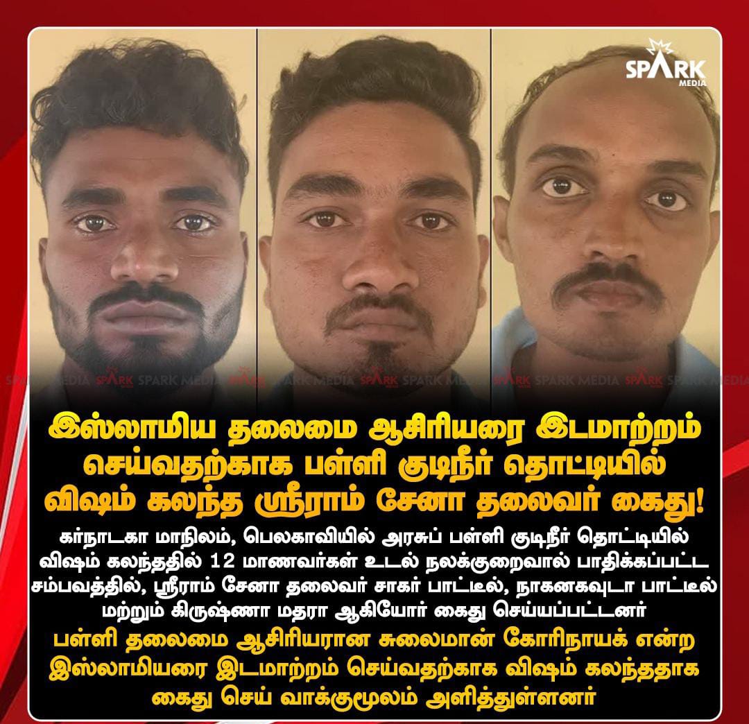 இதையடுத்து அவருக்கு எப்படியாவது அவப்பெயர் ஏற்படுத்தி, பள்ளியில் இருந்து மாற்றி நடவடிக்கை எடுக்க திட்டமிட்டுள்ளனர். அதன் தொடர்ச்சியாக பள்ளியின் தண்ணீர் தொட்டியில் விஷத்தை கலந்துள்ளனர். இந்த சம்பவம் தொடர்பாக சாகர் பாட்டீல், கிருஷ்ணா மதர், மகன்கௌடா பாட்டீல் ஆகிய 3 பேரை காவல்துறையினர் கைது செய்துள்ளனர்.